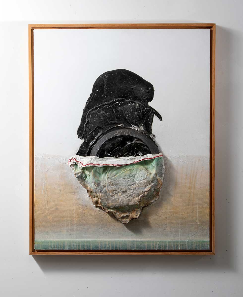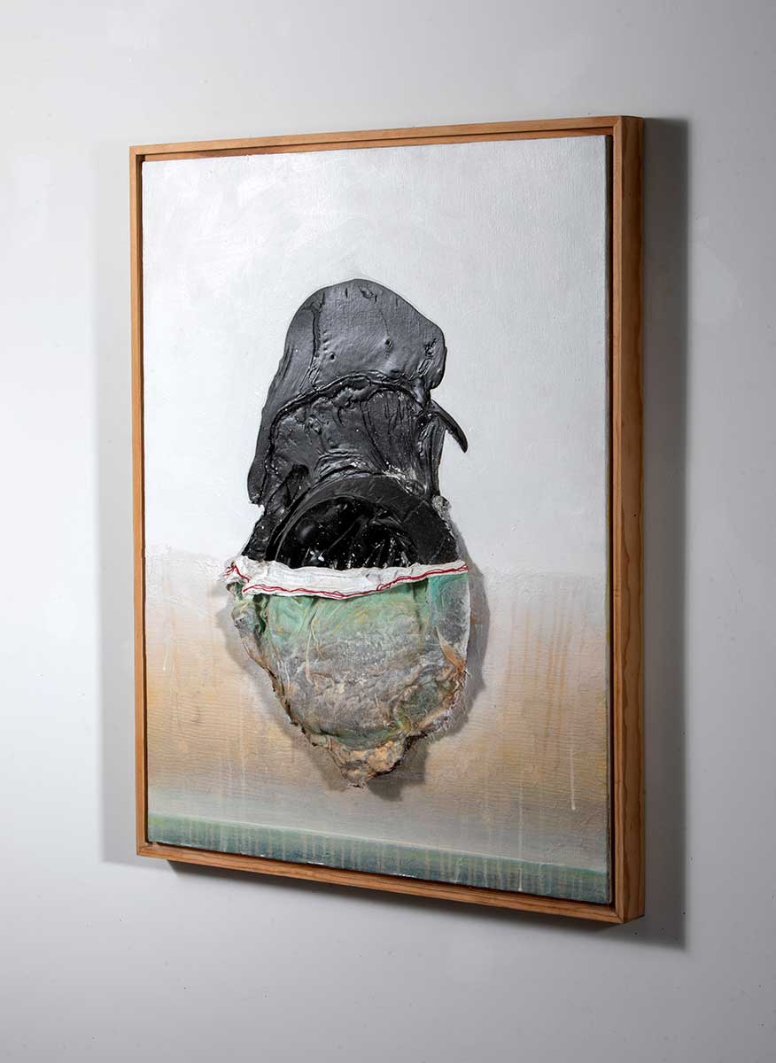 Acrylic, marble dust, fabric, shellac and string on canvas w/ wood frame.
