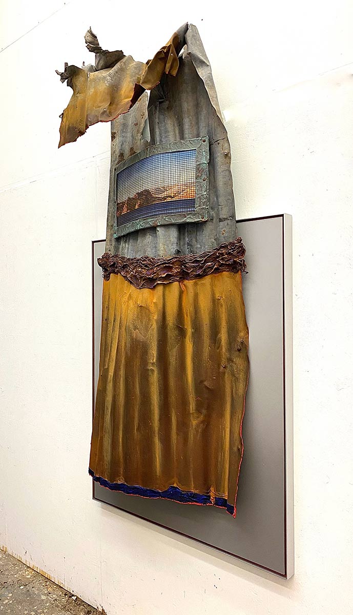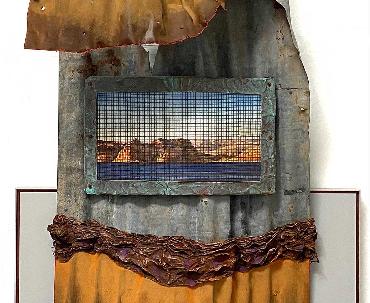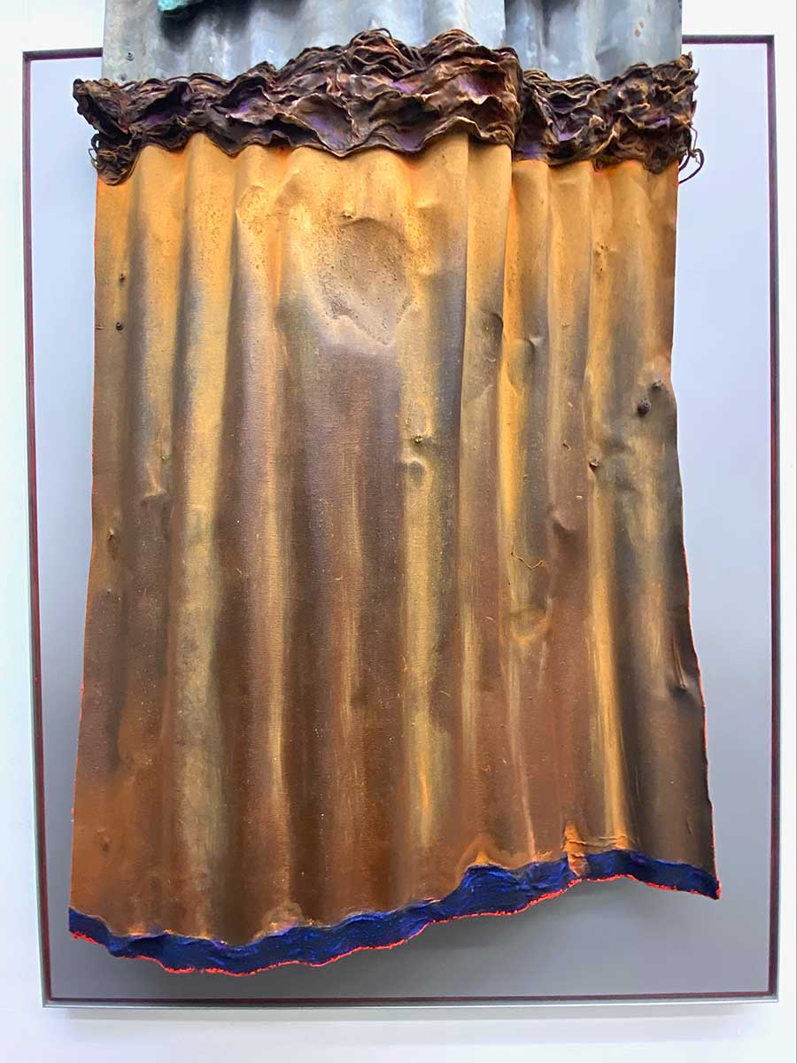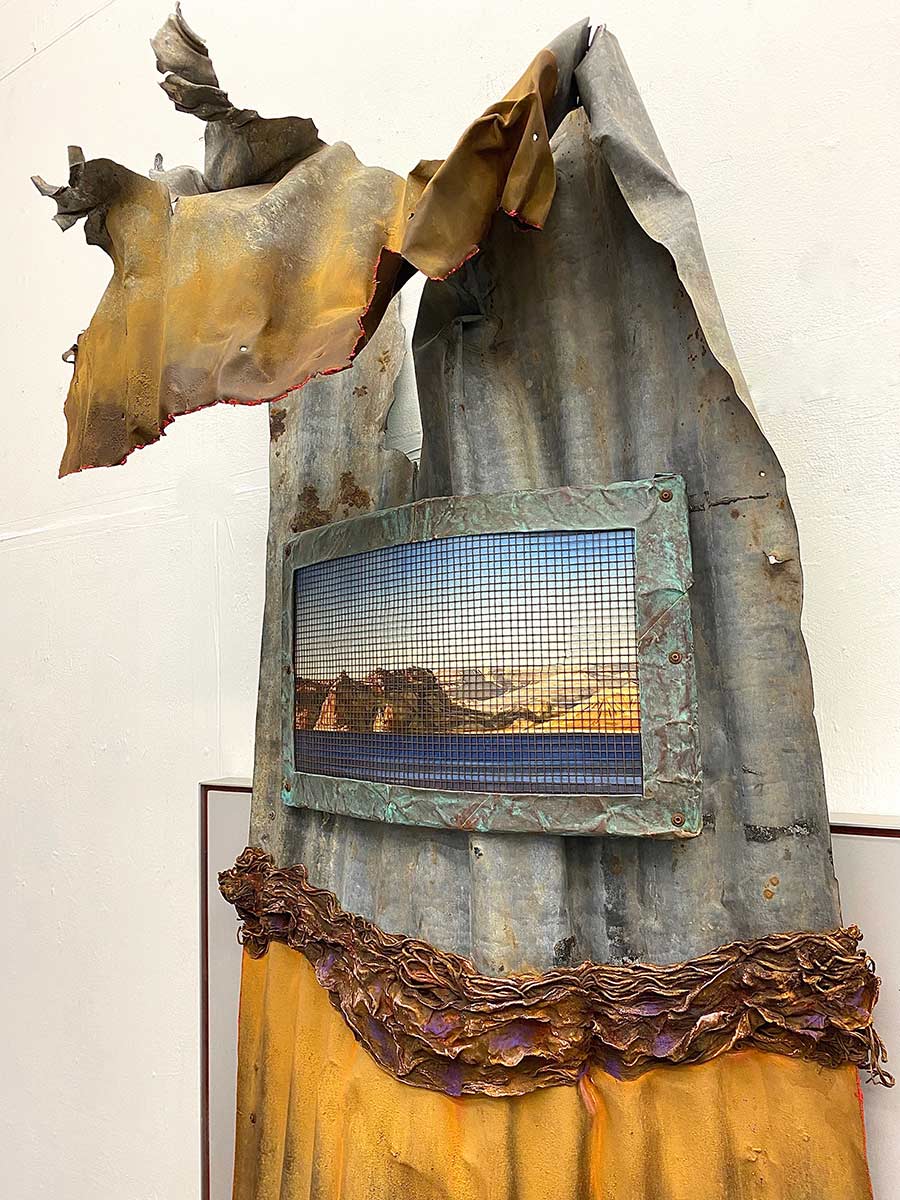 watercolor, string, fabric, hardware fabric, copper and fasteners on galvanized metal.